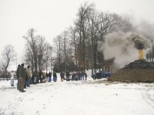 Before starting the fire, Shetler poured diesel fuel over the pile and around the wooden chimney. He also soaked corncobs in diesel fuel and dropped them down the chimney. The idea was to have the hottest fire at the center to stabilize the pile as the wood burned away. It worked. After 15 minutes of black smoke, flames came out the chimney. Within the hour the chimney was gone, but the heat had set the coal and stone on fire.