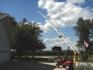 The bottom of the ladder mounts on a 3-pt. mounted pallet jack that he bought at Tractor Supply. He bolted 4-ft. high extensions onto the pallet attachment and mounted the ladder on it, using 1/2-in. conduit pipe as a pivot point.