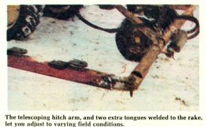 It mounts on the front end of the tractor. A hydraulic cylinder telescopes the hitch arm to adjust for varying field conditions. While the hitch itself raises and lowers from field to road position, it is not designed to hoist the trailing rake into the air forroad travel. The rake must be hitched behind the tractor, or put on a trailer if the roads are not wide enough to pull it down the road on the side hitch. Johnson uses a standard 5-wheel, ground-driven Farmhand wheel rake.