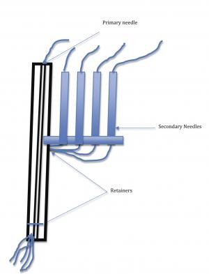 The additional needles mount on a 3/16-in. steel plate attached to the original twine arm. He used Schedule 40, black iron pipe with a 3/8-in. opening for the add-on needles. All five twines feed through the original twine arm entry hole and past the first twine guide on the channel iron arm. The four added twines exit at the second retainer about halfway up the length of the twine arm. From there they feed out and into their needles. The first twine continues up the twine arm to the primary needle.