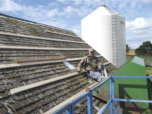 "First I attached 1 by 4-in. purlins to the roof with 4-in. countersunk torx screws. Then I used a neat little trick for installing the new steel sheets," he says. "Each one was 15 ft. long and I needed 12 sheets per side."