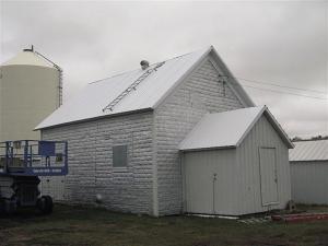 Gutschmidt used his tractor loader bucket and a Genie scissor lift on this project, which worked great for hoisting up the metal sheets, plus he had safe places to stand for attaching the sheet metal.