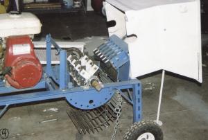 Mini Hammermill Chops Up Garden Nutrients CROPS Miscellaneous Ron Hein s homemade mini hammermill makes great plant food It grinds up horse manure and other material so it s easy to spread and breaks down fast in the soil The 35-in long 16-in wide hammermill is easy to transport with a tow bar on it and can be maneuvered around with drop down handles When we clear out a garden bed in the fall we run the material through the hammermill along with horse or cow manure spread it and till says Hein By spring it s ready to plant and in our dry climate that organic matter helps hold moisture too Hein fabricated a frame out of unistrut channel and 2 by 2 3/16-in angle iron The 1 5/8-in unistrut channels are pre-drilled with holes every 2 in The C-shaped channel has special fasteners designed to slide inside the channel making it ideal as a subframe for mounting the drive engine Unistruts make it easy to slide the engine sideways or back and forth he says Hein also used unistruts for the legs Angle iron was used for the long frame members to mount the engine subframe and the hammermill with hopper The 14 hammers in the mill are 2 by 6 by 1/4-in mild steel plates that Hein hard-surfaced with a surfacing compound The half-pound hammers are mounted to a 1 1/4-in square shaft The shaft is mounted to the angle iron frame with pillow block bearings Each hammer is bolted to a set of steel ears As they wear they can be turned and flipped to expose new edges Welding the ears and balancing the hammers was the trickiest part of the building process says Hein They have to be perfectly balanced or the shaft will torque out of shape Each hammer was punch pressed and jigged to be exactly the same size The hammers pass through a set of 6 knives cut from worn out tillage blades Hein used a hydraulic press to flatten them and then sharpen them The knives are fastened to a steel plate base with Grade 8 bolts and nylon lock nuts to secure knives and hammers alike As the knives wear like the hammers they can be turned three times to expose fresh corner edges A 5 1/2 hp Honda engine with a centrifugal clutch powers the hammermill The go-cart style engine and clutch simplifies controls and operation At idle the hammers hang in place As the throttle advances the clutch engages and the hammers begin to spin The 14 by 16-in hinged hopper made with 16-ga sheet metal widens to a 16 by 20-in mouth It fits over the top of the hammers The hopper mouth has a pipe rim rail around it A piece of sheet metal was fabricated to slide onto the rim and cover up to half the hopper mouth A rubber flap attached to it hangs down into the hopper keeping material that is bouncing off the hammers and knives from being thrown back out of the hopper The hopper is hinged at the rear end of the frame When tipped open a free-swinging leg hinged to the side of the hopper serves as a support Hein used a hydraulic press to form grates with various spacings for different levels of grind from fine to coarse For a first pass with extremely clumpy material such as cow manure he will often remove the grate entirely The grate profiles bring them to within 3/8 in of the hammers Grates are hinged at the rear of the frame and easily removed Two chains fastened at the rear of the frame pull the grates into place and secure them to the frame The second hand engine and clutch cost about $300 but most of the rest was scrap left over from other projects or given to me says Hein I spent about a month and a half just drafting the plans All moving parts on the unit are shielded for safety Hein emphasizes the importance of wearing safety glasses and hearing protectors when working with a hammermill like his Hein may offer a do it yourself info packet for a fee if there s enough interest Contact: FARM SHOW Followup Ron Hein 4475 Meridian Rd Peyton Colo 80831