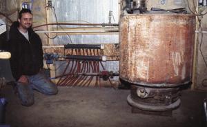 Next, they enclosed the stacked wheels with a water jacket made from a used oil tank. The heated anti-freeze mixture is then pumped through plastic tubing that runs through the shop's floor. The heat is thermostatically controlled.