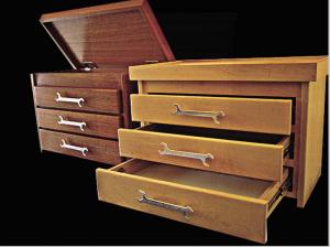 Wrenchers Tool Chest FARM SHOP Miscellaneous dMike Genovese 3607 Justine Dr San Jose Calif 95124 ph 408 728-5281; www wrencherstoolchest com: As a contractor I specialize in kitchen remodels with custom cabinetry says Mike One day I realized I could use my woodworking skills to build a wooden rollaway tool chest to store my mechanics tools That was the start of what is now Wrenchers Tool Chest I use only the finest materials and custom build each tool chest by hand They re stained and sprayed with multiple coats of a satin clear acrylic urethane to provide a rich look with a hard finish His 7-drawer solid walnut chest measures 32 in wide by 24 in deep by 54 in high It weighs about 385 lbs and has solid 1/2-in maple dovetail drawers on full extension soft close glides It has 1 000-lb capacity swivel wheels with locks The top has a hinged storage area Includes solid billet handles with logo rubber-lined drawer bottoms Sells for $3 795 plus S&H An 8-drawer chest with center pull-out shelf measures 38 in wide by 24 in deep by 60 in high Sells for $3 595 plus S&H A 6-drawer chest with stainless steel work top that measures 32 in wide by 19 1/2 in deep by 48 in high The customer has a choice of drawer handles û rocker arms vintage car door or solid billet Sells for $2 895 plus S&H A 5-drawer under-counter unit measures 38 in wide by 23 in deep by 34 1/2 in high Sells for $2 395 plus S&H A 7-drawer upright with stainless steel top measures 23 in wide by 23 in deep by 54 in high Sells for $1 795 plus S&H A 3-drawer bench top unit measures 25 1/2 in wide by 14 in deep by 18 in high Sells for $725 plus S&H