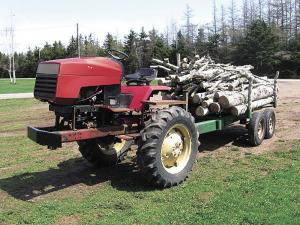 The tractor is hydraulically-steered and small enough to maneuver in the woods yet tough enough to haul big loads such as a 1 1/4 cords of wood