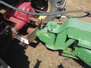 The 16-hp twin-cylinder mower had a vertical shaft, which made it trickier to hook up, but Gallant made it work. He also added an extra transmission from a Ford 1/2-ton truck to add more gears to gear it down for working in the woods. The tractor is "articulated" with a hydraulic cylinder and hinge on the drawbar that mounts to a permanently attached trailer.