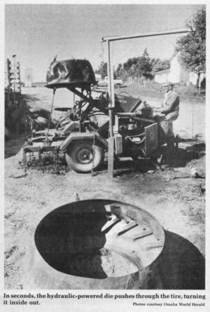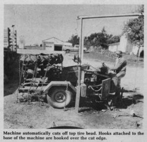 Hass can turn a tractor tire ù start to finish ù in 8 or 9 minutes. The entire operation is automatically performed by his machine, which is self-contained on a 2-wheeled trailer.