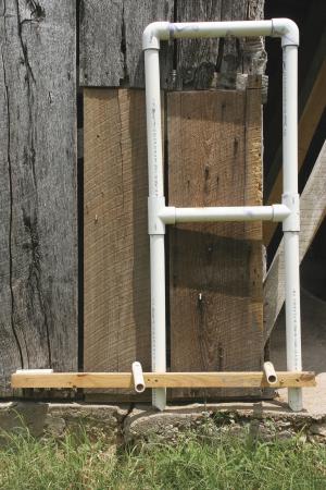 The wooden crossbar maintains a common depth for holes. It also extends another 16 in. beyond one pipe end. As the U ends are pressed down into the bed, a long screw drilled through the end of the slat marks where the next hole in line for that row will go. At the same time, the leg centered on the slat is creating a new hole that was previously marked, and the other end is slipping into the last hole made.