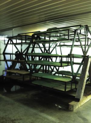The fodder wheel takes up an average of just 12 ft. by 16 ft. and the flats are always at waist height for loading and unloading. The entire unit revolves only once in 30 min. and then stops in place for 2 hrs. before rotating again. As panels rotate past the nozzles, they are sprayed with nutrients and water.