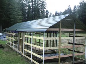 Kunkel built interior cross walls with 2 by 4 construction screwed into the floor. Wall ends attach to the carport uprights, adding rigidity to the entire structure. He also installed a heated 6 by 6-ft. tack room in the center section, leaving the rest for storage.