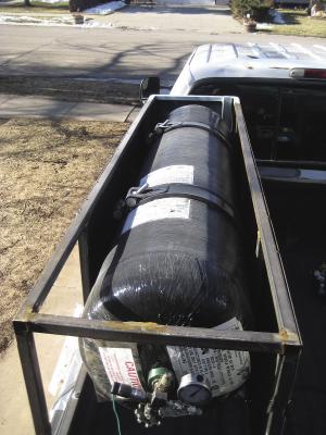 The kit on Carpenter’s truck is marketed by C&E Clean Energy of Sturgis, S. Dak. Carpenter is the “C” in the company name. The kit includes a 10-gal. high pressure CNG storage tank, two regulators and hoses that connect the system to the engine.
