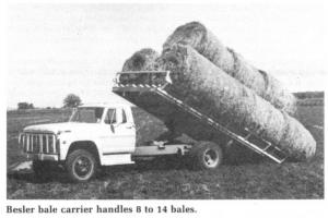 Besler is building four sizes ù in 16, 19, 22 and 25 ft. lengths ù which carry from 8 to 14 bales. All models are 9 1/2 ft. wide and fit on any 2-ton farm truck. By using the truck hoist, the bales can be deposited on the ground in a neat stack just as they were loaded on the carrier. A tractor loader can be used to stack bales onto the carrier.