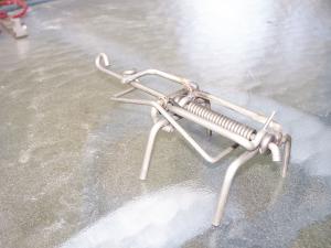 The main body of the scorpion-like design contains the powerful tensioning springs. Like the gopher trap, the “tail” of the mole trap has a loop for attaching a stake or wire.