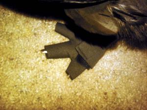 Ordinary first aid wraps won’t stay on so, Kosanke designed right and left booties out of waterproof neoprene. Because heat dissipates through chicken’s feet she left the toes open to provide air circulation. The booties are secured with strong Velcro around the foot and ankle, and the chicken can do what it does naturally – scratch in the dirt and flex its feet to sit on the roost. The bottom piece of neoprene is textured to provide traction, while the top is smooth. In addition to a bandage, there’s room inside for a cotton ball to provide an extra cushion for the foot.