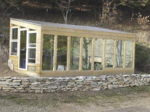They decided to build a greenhouse out of old windows. The walk-in greenhouse is situated on a terraced hillside. The greenhouse itself is 12 by 20 ft., with the back 9-ft. height sl