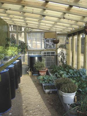 Hot House Made From Windows BUILDINGS Miscellaneous Jim and Lois Blansit of Walnut Shade Mo love having fresh greens all year long but cold Missouri weather makes winters tough They decided to build a greenhouse out of old windows The walk-in greenhouse is situated on a terraced hillside The greenhouse itself is 12 by 20 ft with the back 9-ft height sloping to 7 1/2 ft at the front The walls were framed with 2 by 4’s The roof consists of 26-in translucent acrylic corrugated panels attached to 2 by 6 rafters The entire frame of the greenhouse is treated lumber Windows and sliding doors of all shapes and sizes were built into the walls Inside the greenhouse there’s an in-ground planting bed as well as a planting shelf that sits atop a row of 55-gal plastic drums painted black and filled with water The water warms up during the day and gradually releases the heat into the greenhouse at night creating a moist warm environment – perfect for growing fresh vegetables Contact: FARM SHOW Followup Jim and Lois Blansit 1544 Keithley Rd Walnut Shade Mo 65771 jamesr78@centurylink net