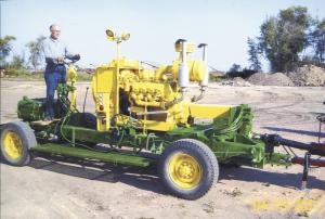 There’s no seat. The operator stands on a platform behind the steering wheel. To go down the road, he stands on one side of the steering wheel and turns the other way, then puts the transmission in reverse. The machine’s starter, throttle, and clutch are located next to the steering wheel, while the pto and hydraulic controls mount on a panel box on one side of the machine.
