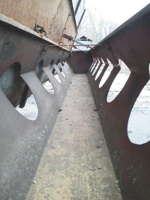“I cut 8-in. round holes with a plasma torch 3 1/2 in. above the board with an 8 in. space between them,” says Fett. “A regular cutting torch gets the thin steel too hot, and it will warp. It’s also easier than trying to cut round holes with a metal saw.”
