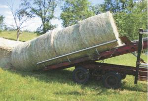 The machine is equipped with a pair of hydraulic-operated forks on front, as well as a push plate that moves bales back 2 at a time. Once all 8 bales are loaded, the operator tips the bales off the back.