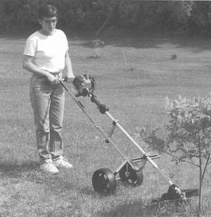 The Kwik Whip Cart is designed to accept most existing gas or electric-operated string trimmers. It rides on a pair of large cushioned wheels and has an L-shaped metal tube that the trimmer clamps onto at two different points. The clamp points have anti-vibration pads and adjust easily to different-size trimmers. It lets you trim under trees and other hard-to-reach places with less bending and stretching.