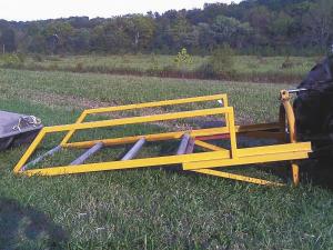 He stripped the sprayer down to a big 3-pt. mounted horseshoe-shaped bracket and subframe on front. He used angle iron to build a 5-ft. wide frame and welded it to the bracket. The boat rides on a series of 2-in. dia. plastic pipes spaced 1 ft. apart, which ride over lengths of 1 1/2-in. dia. steel pipe to act like rollers. Both sides of the boat are contained by side rails made of lightweight unistrut.