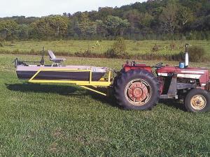 “To load the boat I just slide the boat onto the pipe rollers. When I arrive at the pond I lower the boat into the water and climb off the back of the tractor and into the boat.”