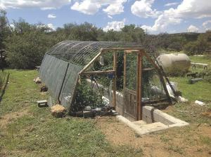 Dean Steward built a 14 by 24-ft. “in-ground” greenhouse for just $120. Going into the ground kept costs down and plants warm. He simply trenched out a walkway between ground level beds, walled it with concrete blocks, and covered the beds with cattle panels and plastic.