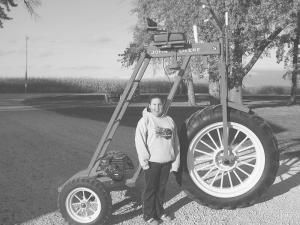 In addition to a ladder to get to the seat, the Rasmussens added a couple of braces for stability. The driver pulls the engine cord to start the engine, climbs into the seat and engages the engine with the throttle. Pushing another lever forward shoves a piece of plate steel against the front tire for brakes.