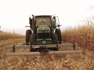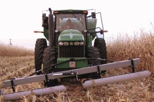 “You don’t have to line up with the rows like you do with shoe-type stalk stompers, which is a big advantage,” says Young. “By covering the entire width of the tractor you can pull a disk diagonally across a field with no problem. It also works great for strip tilling, where you plant right over the rows made the previous year. The center swivel feature works great not only on hills but also on ditches and terraces,” says Young.