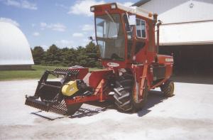 Uni Harvester Rock Picker COMBINES Conversions “It’s much more convenient to use than pull-type rock pickers because it’s so maneuverable and gives me a great view in front ” says Larry Recker Oelwein Iowa who mounted the reel and teeth assembly off an Abco rock-picking unit on front of a New Idea 709 Uni Harvester The 3 1/2-ft wide hydraulic-powered rock picker mounts in place of the Uni Harvester’s husking bed and corn head Recker built a 1/4-in thick steel frame to support the rock picker as well as a 12-ft long 3-ft wide slatted conveyor that mounts on one side of the combine The picker flips rocks onto a wide steel pan Once the pan is full Recker raises it and dumps the rocks into a big steel box positioned over the front end of the conveyor Once the box is full he raises it and drops the rocks onto the conveyor “Every time I dump rocks out of the box I move the conveyor just far enough back to make room for the next dump ” says Recker “I can dump rocks into the box 3 or 4 times before I have to empty the conveyor I usually unload rocks from the conveyor into a loader bucket and then use the bucket to load them onto a wagon for disposal The conveyor came off an old wagon that I pulled years ago behind a seed corn picker ” The Uni Harvester’s hydrostatic drive system works well to operate the rock picker and conveyor says Recker “I use foot-operated pedals to control the hydrostatic drive and the throttle which leaves both my hands free to operate the hydraulic valves that control the rock picker I use 2 hydraulic cylinders to raise and lower the rock picker and 2 cylinders to dump the pan The conveyor is driven by a hydraulic motor “I built it in the mid 1990’s and use it each spring on every acre of our ground ” says Recker “I already had the Uni Harvester which I had used for many years to pick seed corn “The rock picker can handle rocks as big as 2 ft in diameter If I have to dig a bigger rock out of the ground I can bolt a heavy duty spear onto the picker and use it to push the rock out of the ground Then I remove the spear and use the rock picker to pick it up off the ground ” Contact: FARM SHOW Followup Larry Recker 1211 3rd St N E Oelwein Iowa 50662 ph 319 283-0535