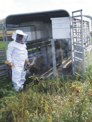 He only has one complaint about his trailer hives. The bees tend to only go outside and not inside the trailer. So when he works the hives he doesn’t get stung very often.
