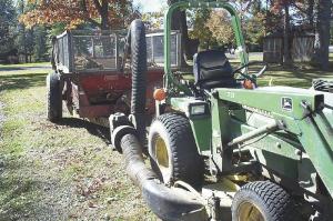 “The spreader is wider than the tractor so I offset the drawbar and manure spreader to the right, which allows me to pick up leaves close to a tree or house. For any areas that I can’t reach, I use a garden tractor equipped with a commercial leaf vac and then empty the full bags into the spreader.”