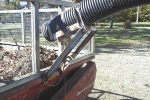 An adjustable hose mount lets him change the angle of the discharge hose, allowing him to direct leaves to the front, middle or rear of the spreader. The hose is bungee strapped to a metal bracket that’s bolted to the spreader. A piano-type hinge beneath the bracket can be adjusted to move the hose up or down.