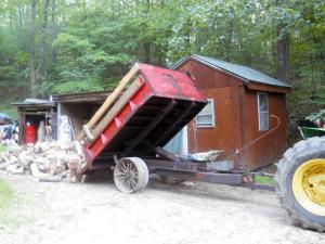 “We use it for hauling and dumping firewood and other jobs around our farm. It eliminates the need to unload wood by hand,” says Bond. “We use our Deere 2350 tractor to pull it. The dump truck sat in the woods until we decided to make a trailer out of it. We added wooden sides to the box to increase the capacity.”