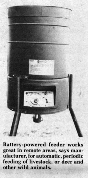 When activated, the unit feeds out 1/z lb. of grain or pellets per second and can be set to run several times each day. Feed is spread by a rotor, powered by a battery which lasts 2 to 6 mos. Feed is spread up to 75 ft. away, depending on height off the ground.