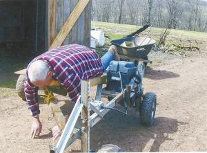 His picking platform is propelled by a small electric motor that Tice pulled from an old dump truck. “The motor was used to roll and unroll a heavy tarp,” Tice says. He mounted the motor with it’s sprocket drive in line with a sprocket connected to the left rear wheel. An old bicycle drive chain connects the two sprockets. Power to drive the motor and move the platform comes from a deep cycle 12-volt battery.