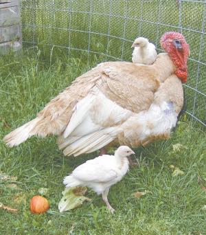 Allen started with a few birds and has built her breeding flock to 9 hens and 3 toms. The birds have rich, reddish-buff body feathers with white to light buff tail and wing feathers. Hens will reach about 14 lbs., and older toms will reach 28 lbs. Each year she sells about 50 turkeys for meat, processing them on her farm herself.