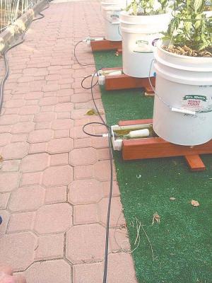 At first, he planted tomatoes in 5-gal. buckets set inside other buckets. But he needed to add water every morning and night.