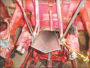 After the pto unit has been rebuilt and bolted back onto the tractor, Grenzow uses a 5-gal. bucket and a homemade trough to fill the differential with oil. “It lets me add oil fast and without making a mess,” he says. “The trough is made from light sheet metal and measures 18 in. long by 8 in. wide at one end, tapering down to 5 in. The way I built the trough it’ll stay in place by itself.”