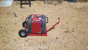 The cart rides on 10-in. pneumatic tires that allow the cart to roll easily on uneven ground. The handle can be adjusted to different angles with a simple pin, allowing for people of different heights and also allowing different weight load distribution while moving it. “The position of the handle shown in the photo is best for moving the cart while it’s running, as it keeps the oil level correct in the generator’s motor,” notes Kligora.