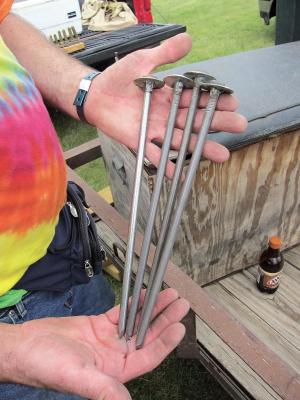 Cheap 12-in Pole Barn Nails Keep Tent Secure FARM SHOP Miscellaneous I often attend antique tractor shows and stay overnight in a tent at the show site I don’t like using those long plastic spikes to stake the tent down because they can easily break when pounded into hard ground So I went to a local hardware store and bought some cheap 12-in pole barn nails then welded 3/8-in dia fender washers under the heads to keep the rope from sliding off the nail Dave Dam 111 N Buena Vista Rd Eau Claire Wis 54703; ph 715 450-2943