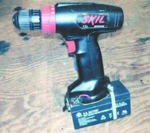 “Here’s how I salvaged my 12-volt cordless drill after the original battery packs failed. I bought a small 12-volt gel cell battery from a surplus store. Then I cut the top off an old battery case, extended the wires from the drill, and strapped the new battery onto the bottom.