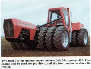 For work with large equipment, the rear engine can be used for pto drive while the front engine is used to drive the tractor. For lighter jobs, or over-the-road transport, one engine may be used only, thus using it the same as a 210 hp tractor.