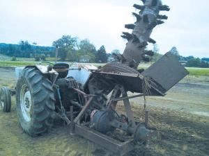 “I thought a truck differential would do the job of a right angle drive, and found a 20,000-lb. broken axle in a friend’s scrap bin,” says Bernier. “The axle was geared a little low at 5.28:1, but my tractor has a 2-speed pto which results in about 200 rpm’s at the end of the axle. I had to mount the housing upside down to get the correct rotation. I cut off the unneeded axle tube, welded the spider gears to the cage to eliminate differential action, and carefully aligned everything so that it runs true.”