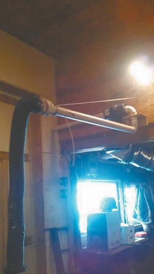 The exhaust system sets about 7 ft. above the shop floor on a wall above the working area. It consists of 2-in. dia. pvc pipe and elbows that hook up to a 1 hp, 110-volt air pump from a Jacuzzi hot tub. A 3 1/2-in. dia., accordion-style vent tube (the air induction tube off a car) hangs down from the end of a horizontal 5-ft. length of pvc pipe. The pipe is supported by a cable and pivots 180 degrees on a male and female threaded coupler.