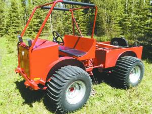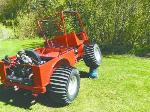 The ATV is powered by a 1948 VW Beetle engine and has front and rear differentials from an old Toyota pickup. Steering works off hydraulics, powered by a power steering pump from a Chevy van. The dune buggy tires came from Xtreme Tire in Arizona.