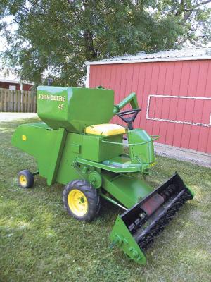 Gary Luthman’s half-scale combine looks like a mini John Deere 45 but works like a lawn mower. The 5-ft. header is fitted with three 21-in. reel mowers mounted side-by-side.