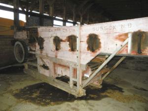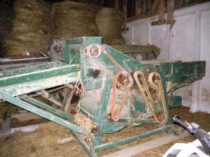 He picked up a Sussex Little Giant threshing machine at an auction. The thresher is only 3 ft. by 16 ft. and about 5 ft. tall. It was a junior version of larger threshers used on larger farms. He figures it'll be ideal as he grows out select varieties.