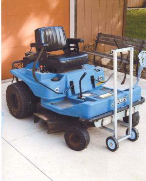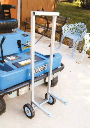 The dolly is made from 1-in. sq., steel tubing and rides on two 6-in. rubber wheels. It measures about 36 in. long and 10 in. wide and has a pair of 9-in. long, horizontal lift fingers on front that are fitted with 2-piece metal brackets. The brackets form a cradle for a 1/2-in. dia. metal “lift rod” that Egleston bolted on under the front end of the mower.